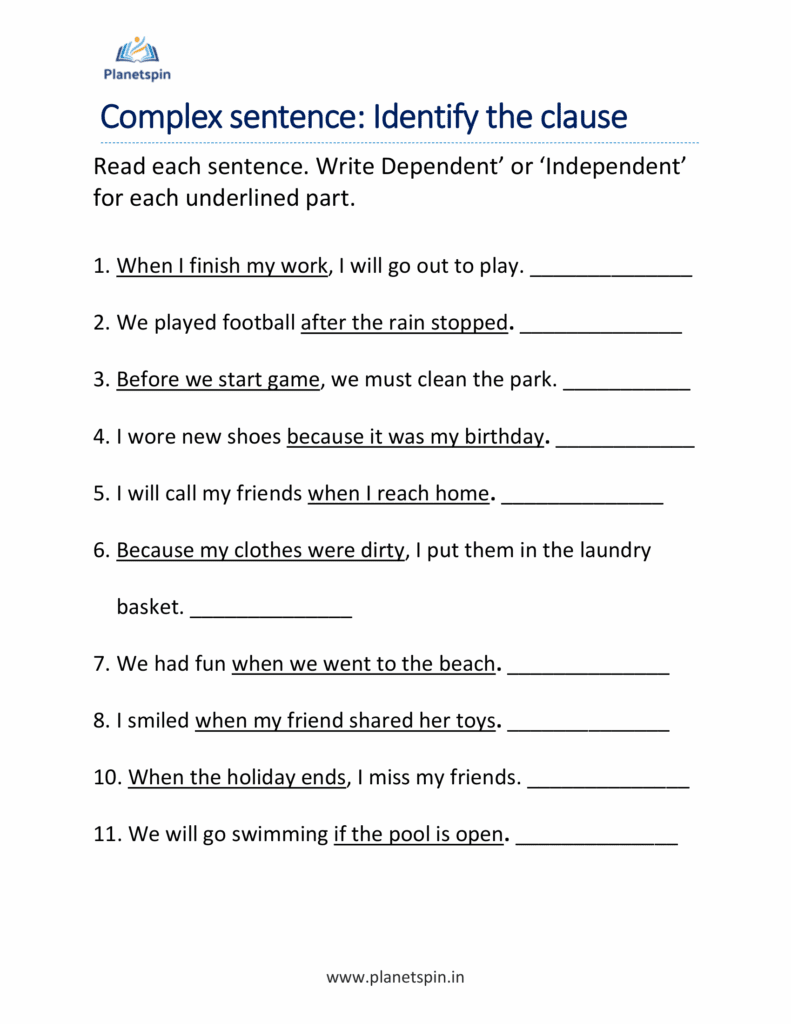 A complex sentence has two parts – one part can stand alone, and the other part needs help to make sense. These parts are joined by special words like so, and, because, but if, after etc. Download the complex sentences worksheet by clicking on the image.
