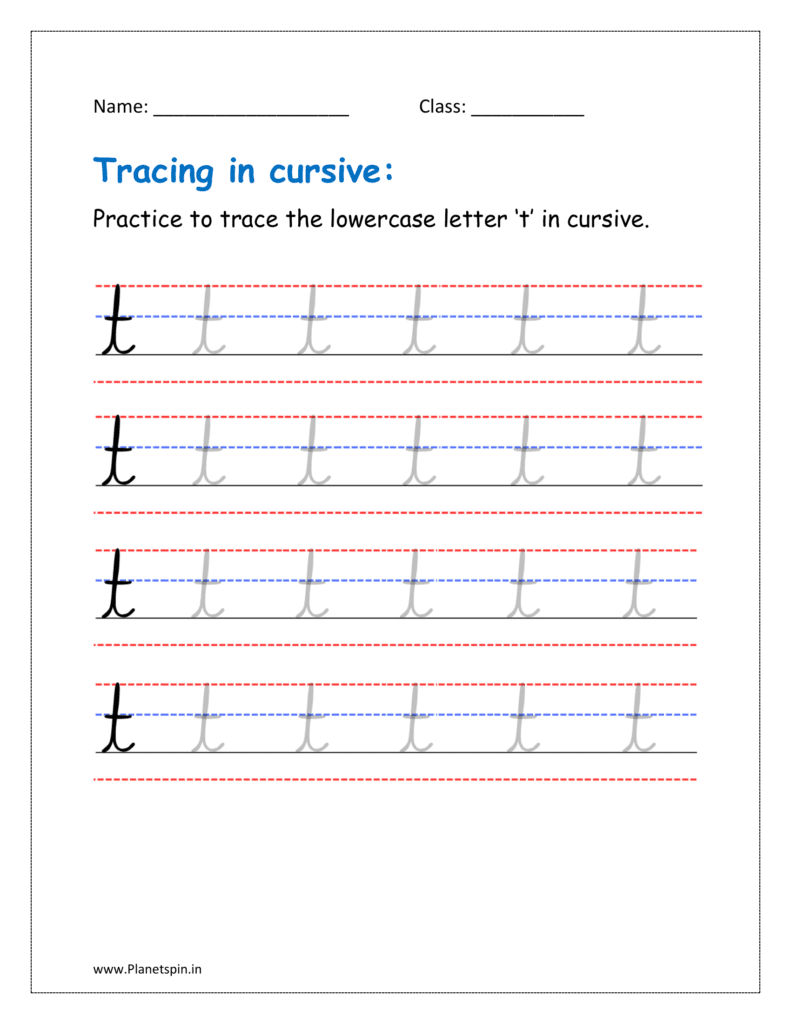 These are the free printable worksheet PDF for tracing and writing the Cursive lowercase t on four lines.