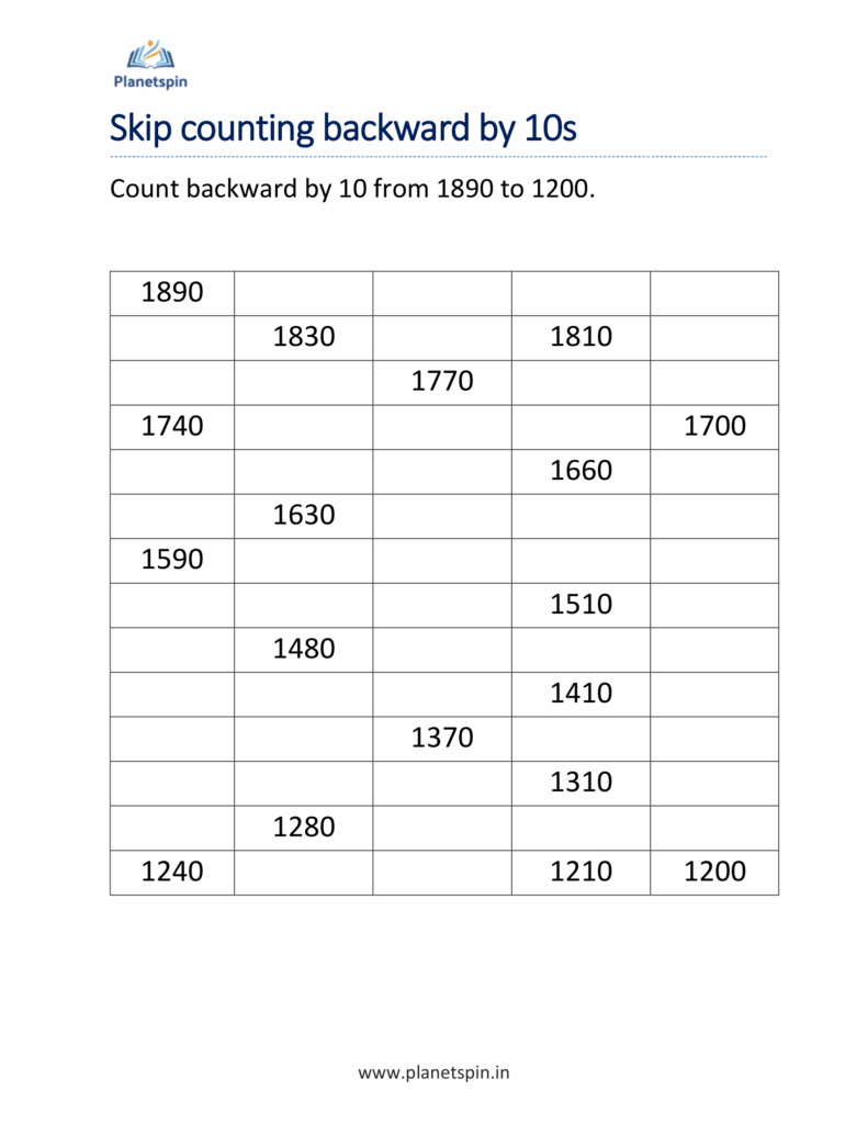 Skip counting backwards by 10 worksheets