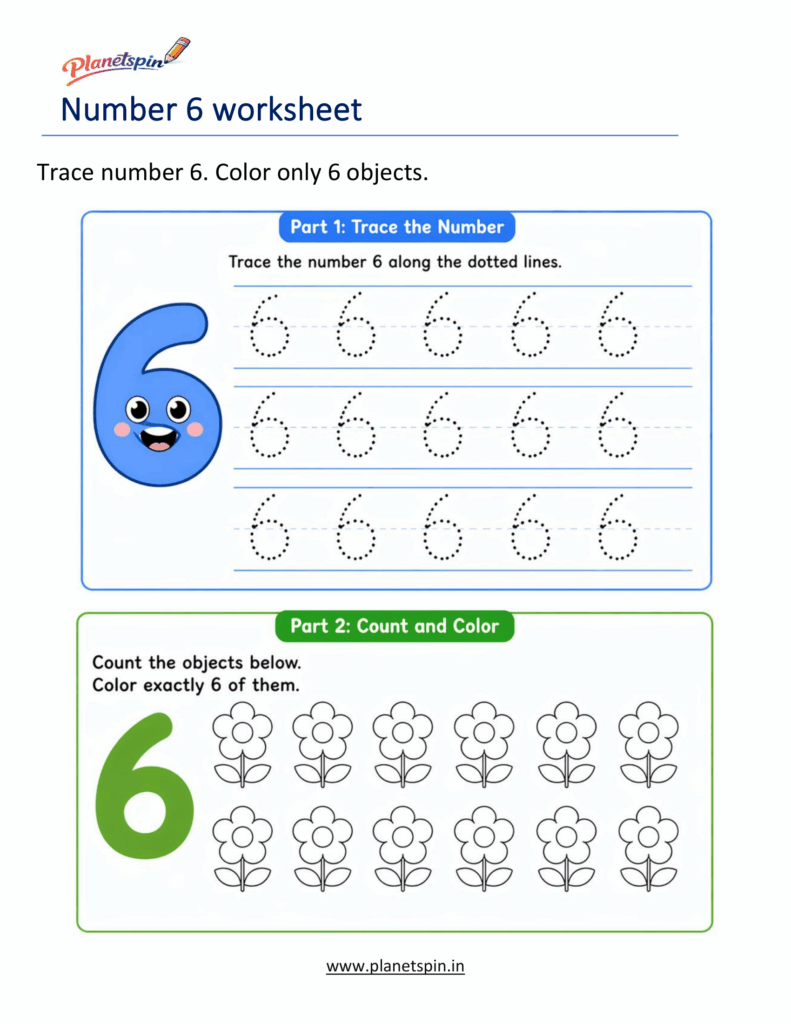 These include a list of exercises in the worksheet to learn, trace, write, and count the number 6: